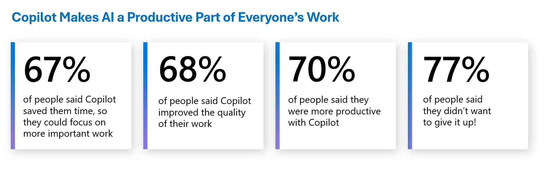 Microsoft Copilot isn’t just a promising idea — it’s already making a measurable difference for people using it in their daily work. According to Microsoft’s Work Trend Index Annual Report³, which surveyed thousands of users across industries, the results speak for themselves.